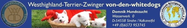 |  | | | Wir betreiben die Hundezucht mit Verstand und nach neuesten Gesichtspunkten. Alle Hunde leben in unserem Haus; die Welpen werden hier aufgezogen. Zur Zeit haben wir fünf Westhighland-Terrier in der Zucht